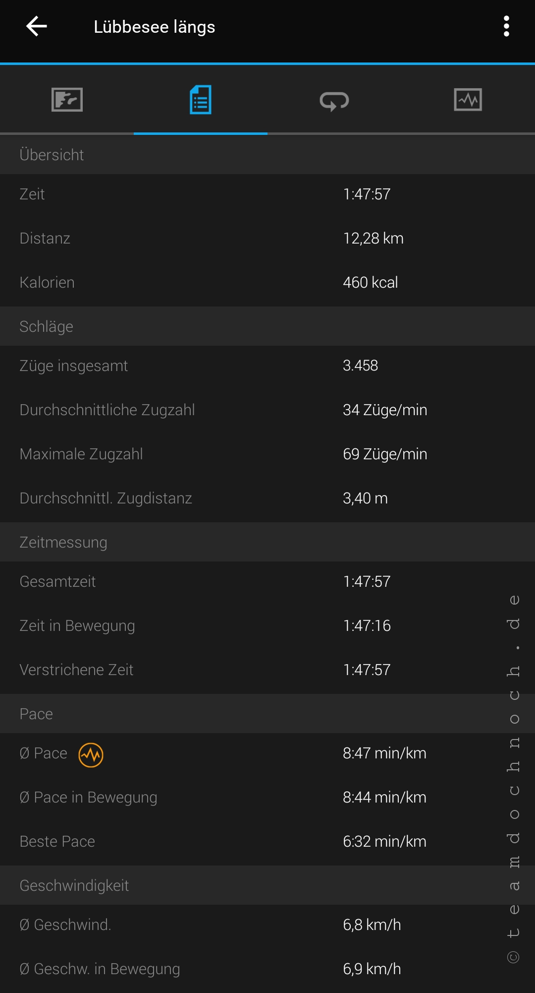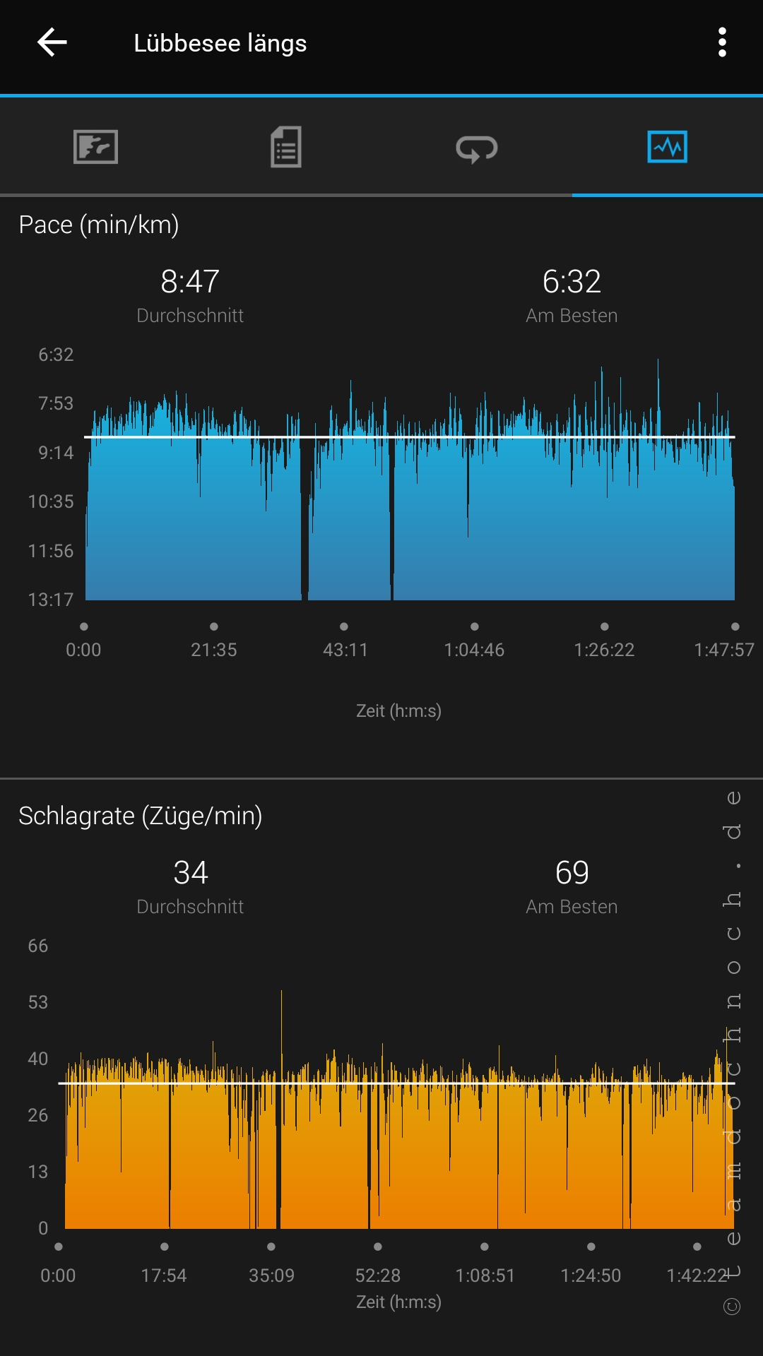 Am Ende mal etwas Statistik. Die Lübbesee-Tour war eine meiner längsten bisher und dazu auch noch sehr zügig. Der Pace lag meist weit unter 9 Minuten/Kilometer und am Ende war es fast ein Schnitt von 7 km/h. Auf meinem ersten Brett lag der immer eher so bei 5 – 5,5 km/h: