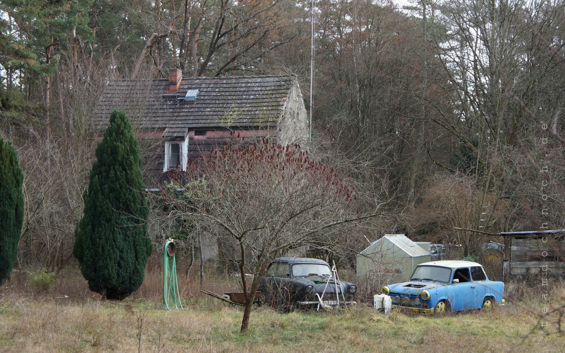 Ab Steinhöfel (Gemeinde im Landkreis Oder-Spree) wird es wieder waldiger. Wir finden einen geradlinigen relativ frisch geschotterten Waldweg nach Berkenbrück. Im Wald treffen wir auf eine kleine Ansammlung von alten kleinen Autos.