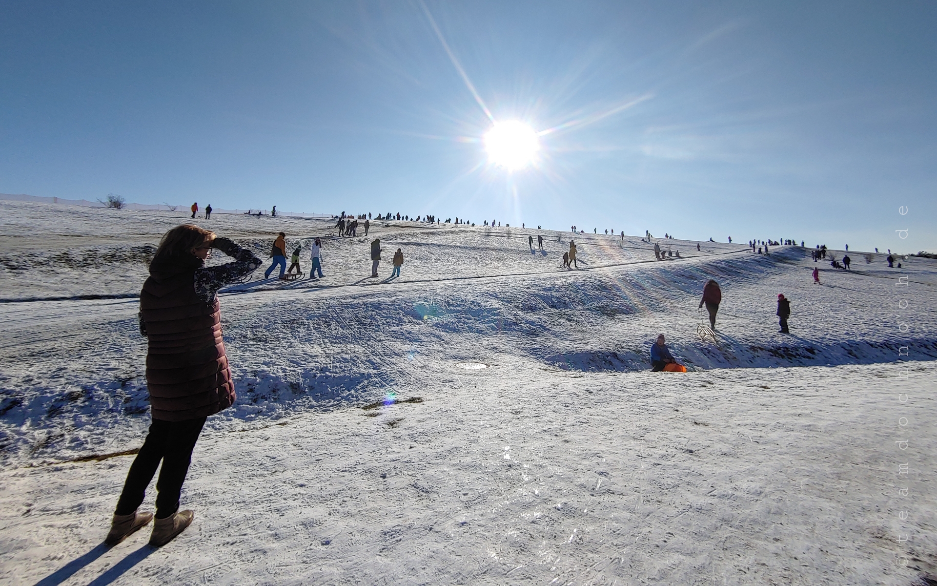 Dann fühlen wir uns plötzlich mitten in einem Skigebiet. Der Stolper Berg in Kleinmachnow ist erreicht. Die wenigen Zentimeter Schnee reichen für eine Menge Spaß.