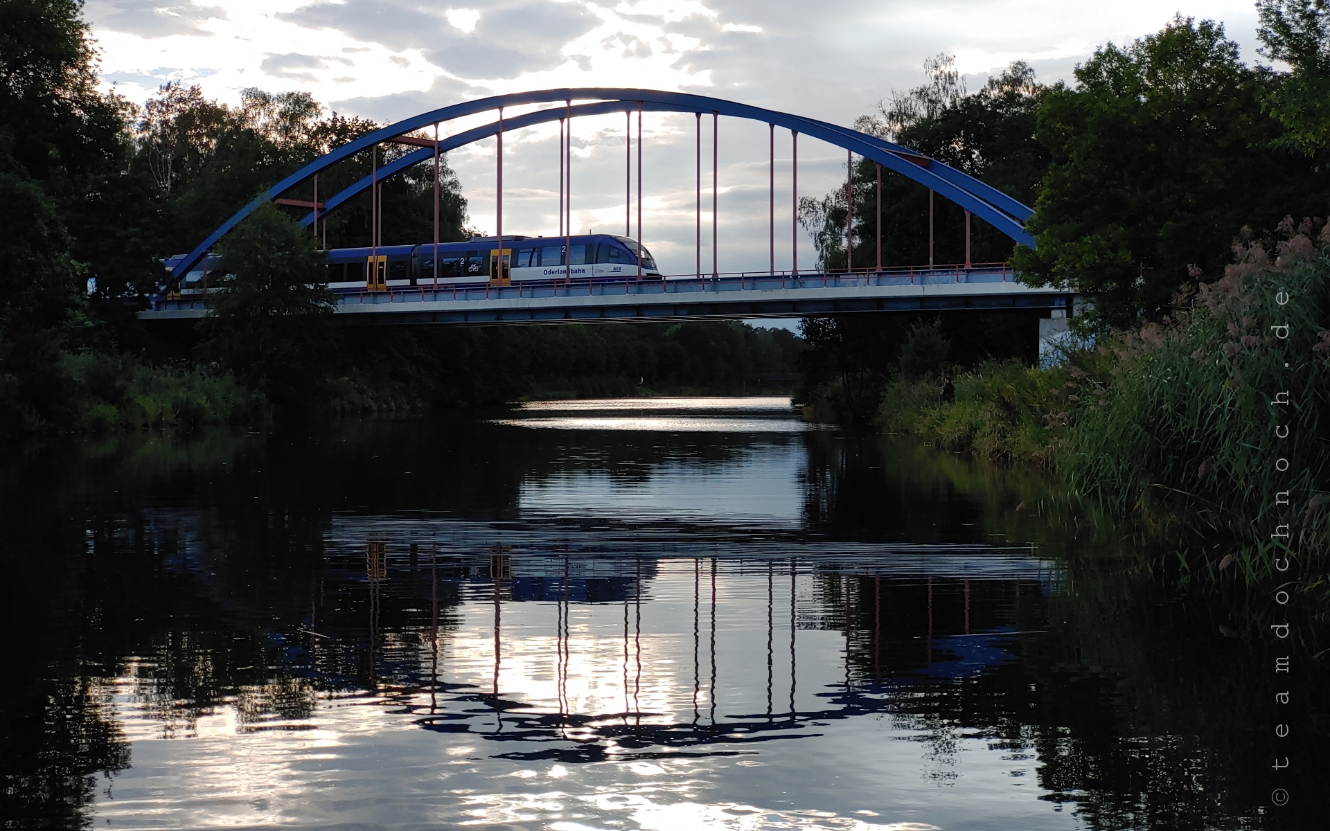 Gerade, als ich kurz vor der Brücke der Heidekrautbahn über den Oder-Havel-Kanal bin, rumpelt es laut. Ein Triebwagen der NEB (Niederbarnimer Eisenbahn) überquert den Finowkanal auf der alten Brücke und gibt mir genug Zeit, die Kamera für ein Bild auf der vor 15 Jahren neu gebauten Brücke über den Oder-Havel-Kanal hervorzuholen.